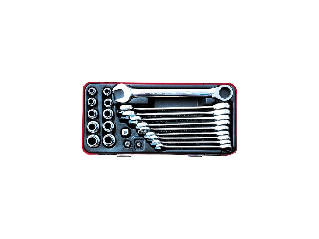 - 10x klíč očkoplochý ráčnový: 10, 11, 12, 13, 14, 15, 16, 17, 18 a 19 mm
