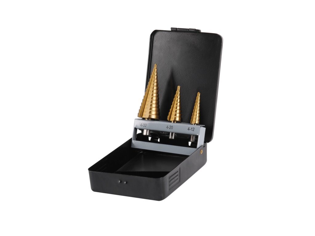 Stupňovité vrtáky se používají pro vrtání kruhových otvorů v slitinových i neslitinových ocelových plátech, trubkách a profilech do tloušťky stěny 4mm, k navrtávání a odhrotování v jedné pracovní operaci. Lze je použít také pro vrtání do měkčích materiálů, např. dřeva, plastů a plexiskla. Kuželový vrták je určen pro plynulé a bezhrotové vrtání a navrtávání otvorů bez deformace plechu. Vrtáky je možné znovu naostřit.- titanový povrch zvyšuje odolnost vrtáků